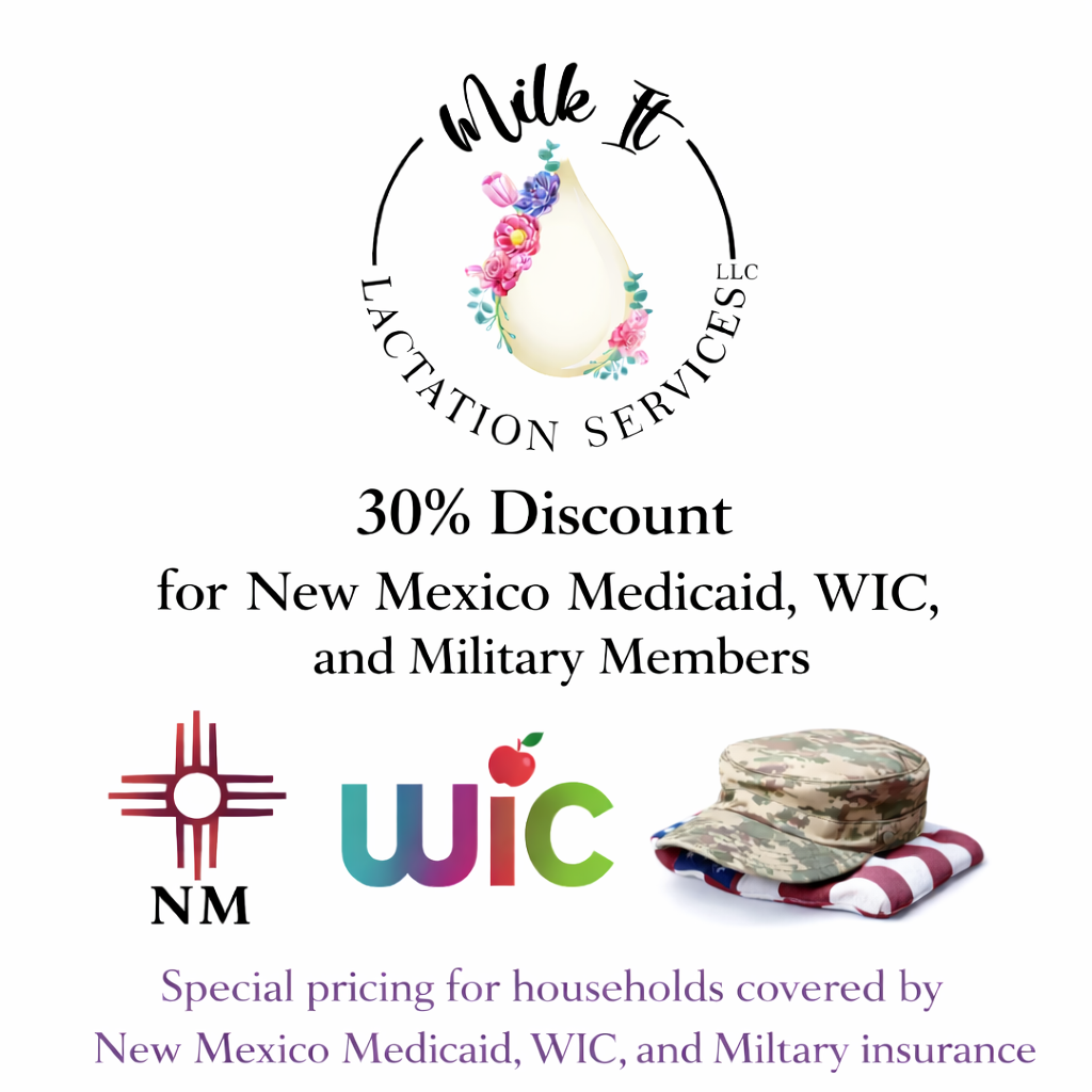 Milk It Lactation Services is committed to improving access to lactation care in our community. We offer a 30% discountfor families with New Mexico Medicaid, WIC benefits, or active military status.
